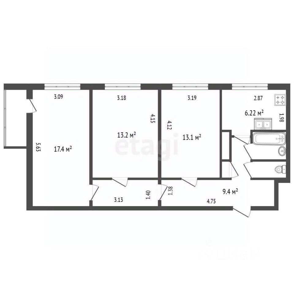 — Изолированные комнаты 19,4+13,2+13,1 м2