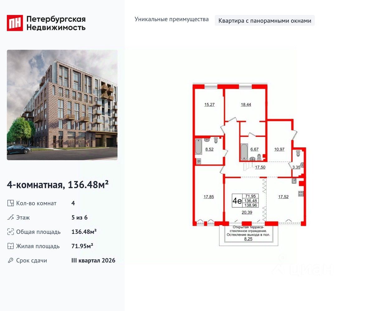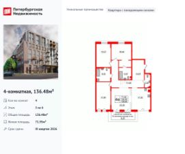 Уникальная планировка, кухня 17.52 м², просторная прихожая 10.97 м². Общая площадь квартиры - 136.48 м², жилая 71.95 м².