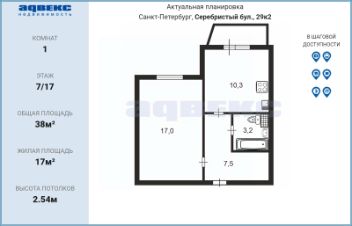 Светлая комната 17 кв.м, кухня 10,3 кв.м с застеклённым балконом 3,5 кв.м. Большой коридор 7,5 кв.м.