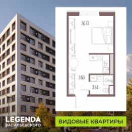1-комн. квартира-студия с предчистовой отделкой в ЖК "LEGENDA Васильевского" на 10 этаже. Общая площадь: 28.1 кв.м., площадь гостиной 20.73 кв.м., из которых 5 кв.м. выделено под кухонную зону. Все окна выходят на одну сторону. В квартире один совмещенный санузел. Высота потолков 2.72 м.
