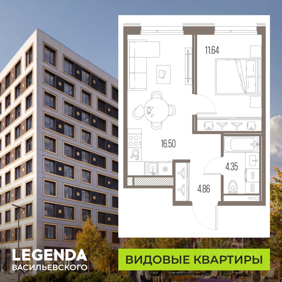 1-комн. квартира от застройщика с предчистовой отделкой в ЖК "LEGENDA Васильевского" на 7 этаже. Общая площадь: 37.35 кв.м., жилая: 11.64 кв.м., площадь просторной кухни-столовой: 16.5 кв.м. Все окна выходят на одну сторону. В квартире один совмещенный санузел. Высота потолков 2.72 м.