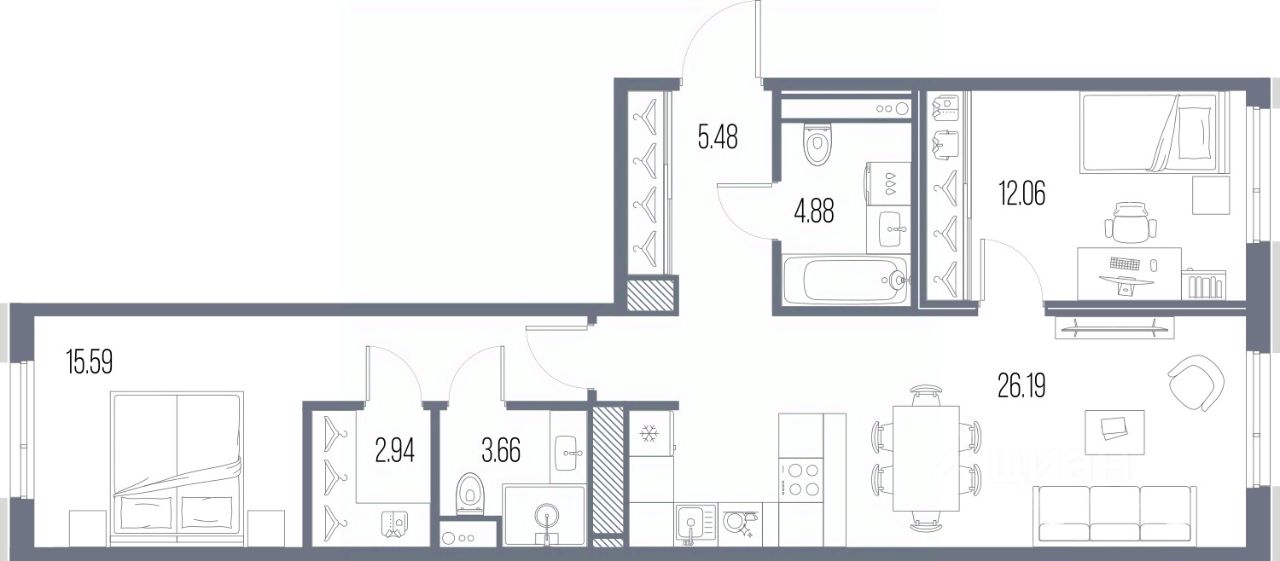 Продается двухкомнатная квартира с предчистовой отделкой в ЖК "LEGENDA Васильевского" на 2 этаже. Общая площадь: 70.8 кв.м. Высота потолков 2.72 м.