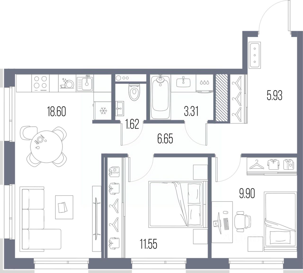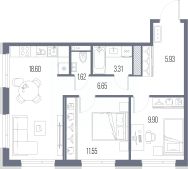Продается 2-комн. квартира с предчистовой отделкой в ЖК "LEGENDA Васильевского" на 2 этаже. Общая площадь: 57.56 кв.м. Высота потолков 2.72 м.