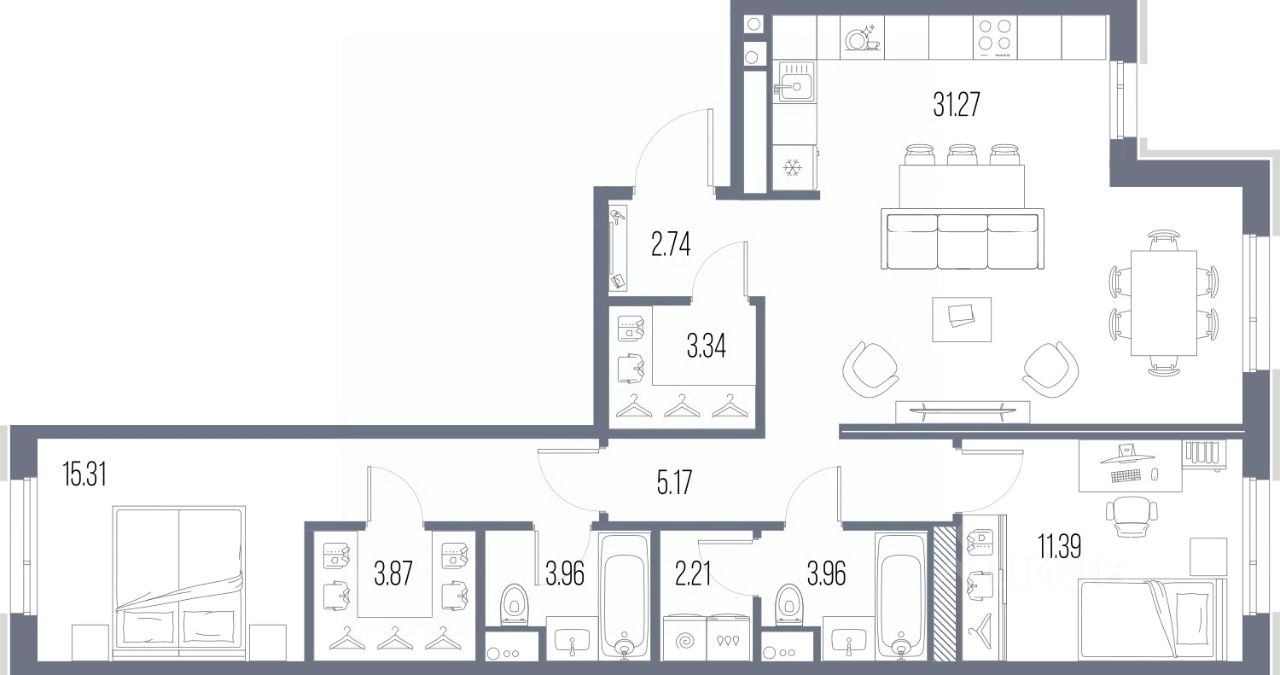 2-комн. квартира с предчистовой отделкой в ЖК "LEGENDA Васильевского" на 2 этаже. Общая площадь: 83.22 кв.м. Высота потолков 2.72 м.