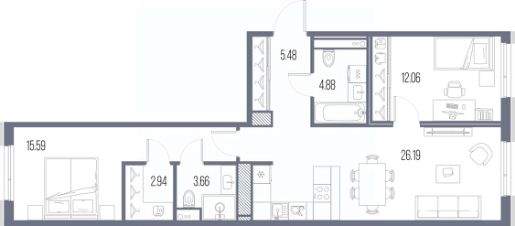 2-комн. квартира от застройщика с предчистовой отделкой в ЖК "LEGENDA Васильевского" на 3 этаже. Общая площадь: 70.8 кв.м. Высота потолков 2.72 м.