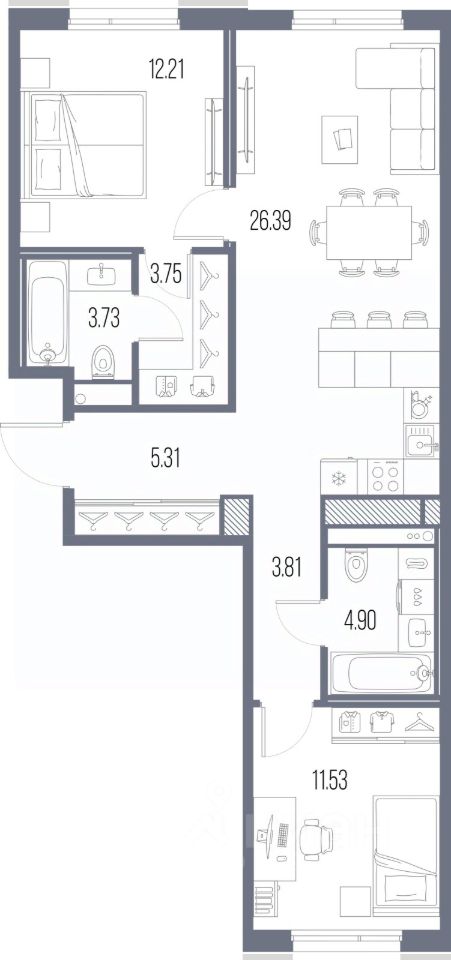 Просторная двухкомнатная квартира с предчистовой отделкой в ЖК "LEGENDA Васильевского" на 4 этаже. Общая площадь: 71.63 кв.м. Высота потолков 2.72 м.