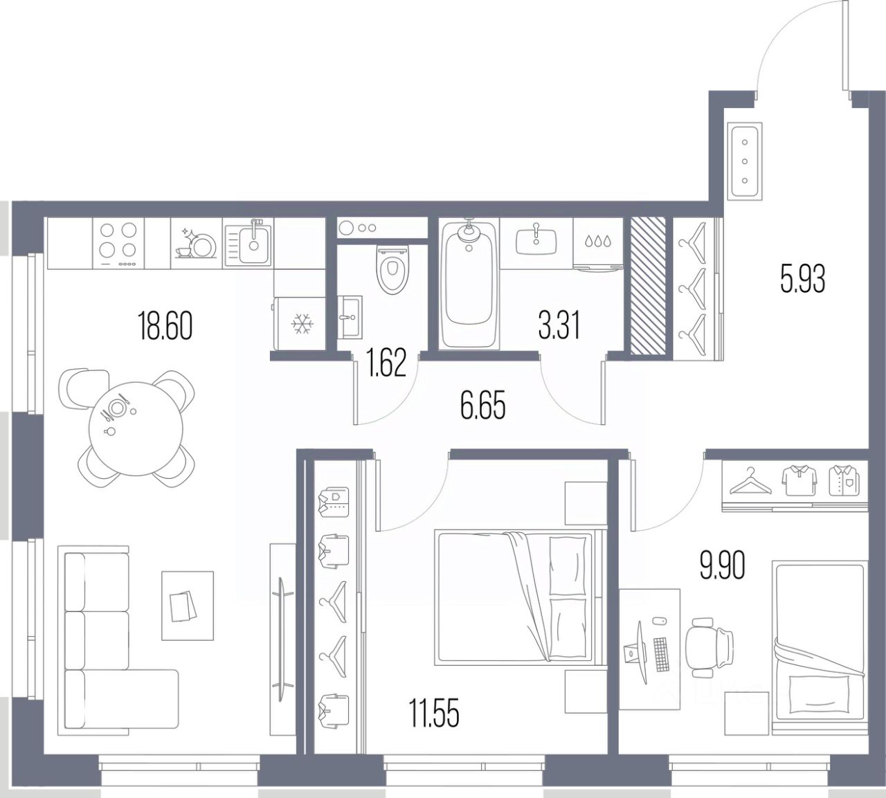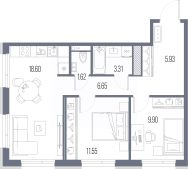 Просторная 2-комн. квартира с предчистовой отделкой в ЖК "LEGENDA Васильевского" на 3 этаже. Общая площадь: 57.56 кв.м. Высота потолков 2.72 м.