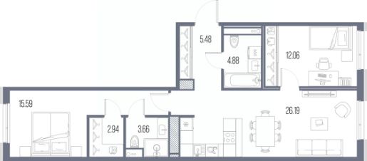 Просторная 2-комн. квартира с предчистовой отделкой в ЖК "LEGENDA Васильевского" на 5 этаже. Общая площадь: 70.8 кв.м. Высота потолков 2.72 м.
