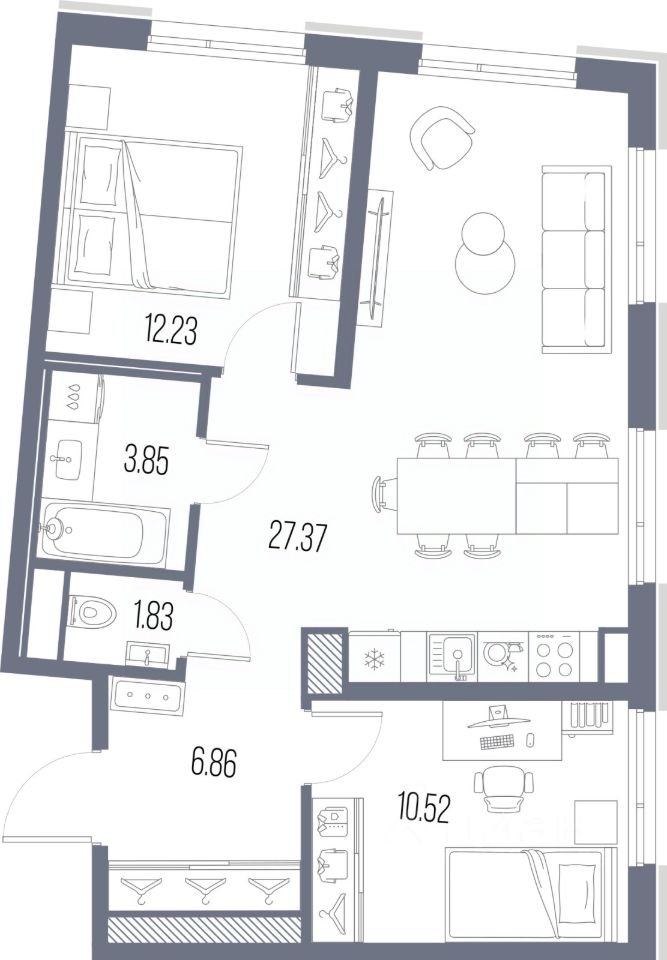 Двухкомнатная квартира с предчистовой отделкой в ЖК "LEGENDA Васильевского" на 5 этаже. Общая площадь: 62.66 кв.м. Высота потолков 2.72 м.