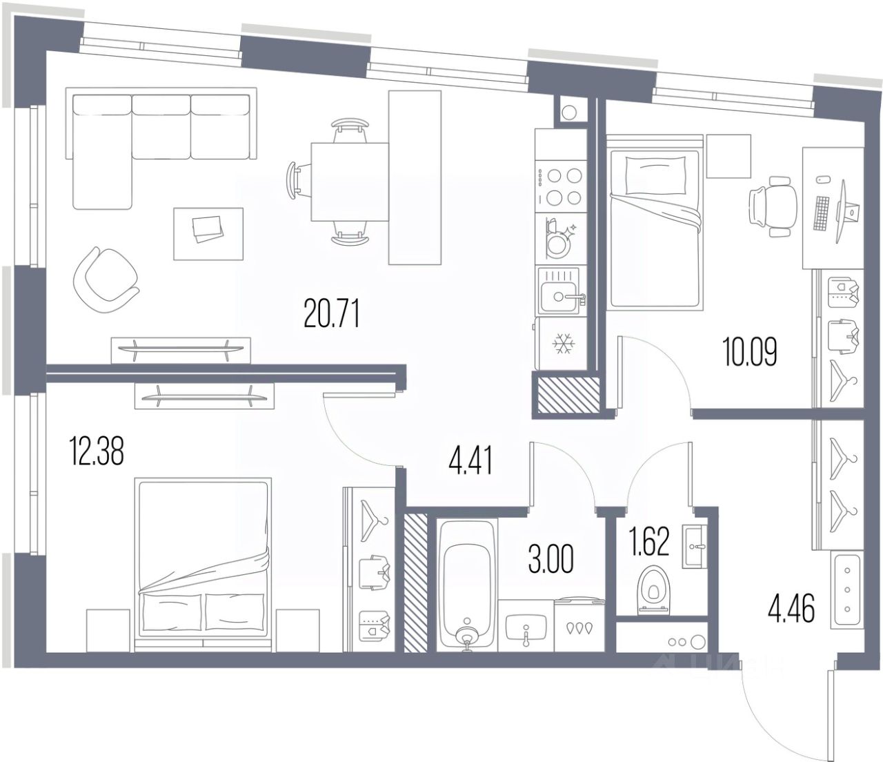 Просторная 2-комн. квартира с предчистовой отделкой в ЖК "LEGENDA Васильевского" на 4 этаже. Общая площадь: 56.67 кв.м. Высота потолков 2.72 м.