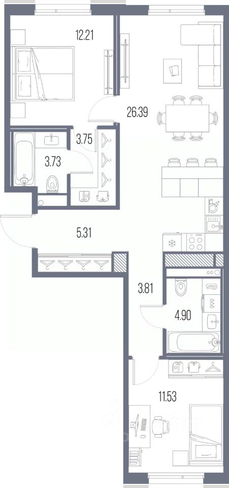 2-комн. квартира от застройщика с предчистовой отделкой в ЖК "LEGENDA Васильевского" на 6 этаже. Общая площадь: 71.63 кв.м. Высота потолков 2.72 м.