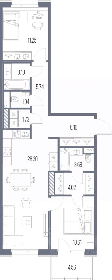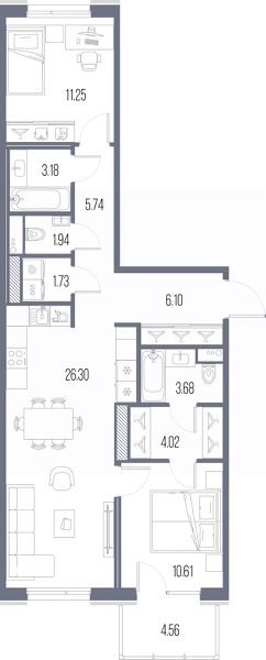 Двухкомнатная квартира от застройщика с предчистовой отделкой в ЖК "LEGENDA Васильевского" на 5 этаже. Общая площадь: 74.55 кв.м. Высота потолков 2.72 м.