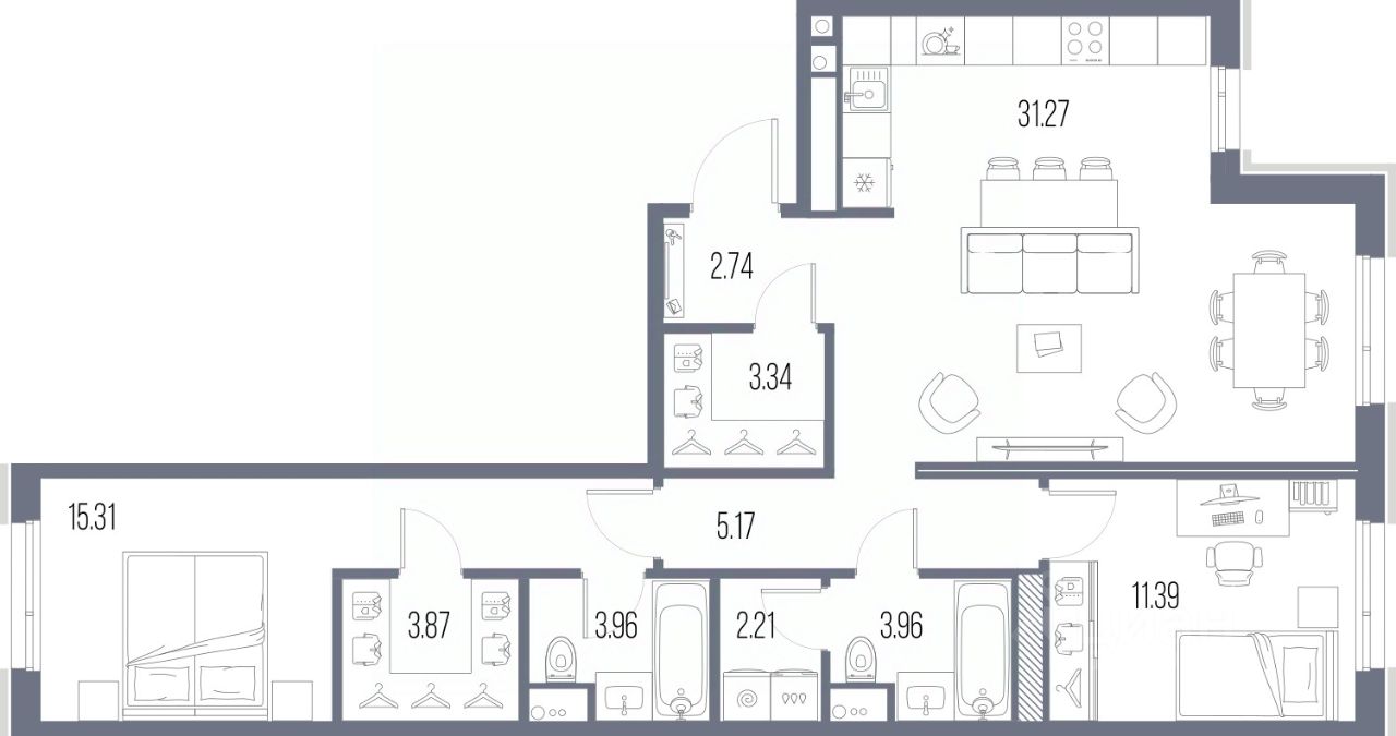 2-комн. квартира от застройщика с предчистовой отделкой в ЖК "LEGENDA Васильевского" на 5 этаже. Общая площадь: 83.22 кв.м. Высота потолков 2.72 м.