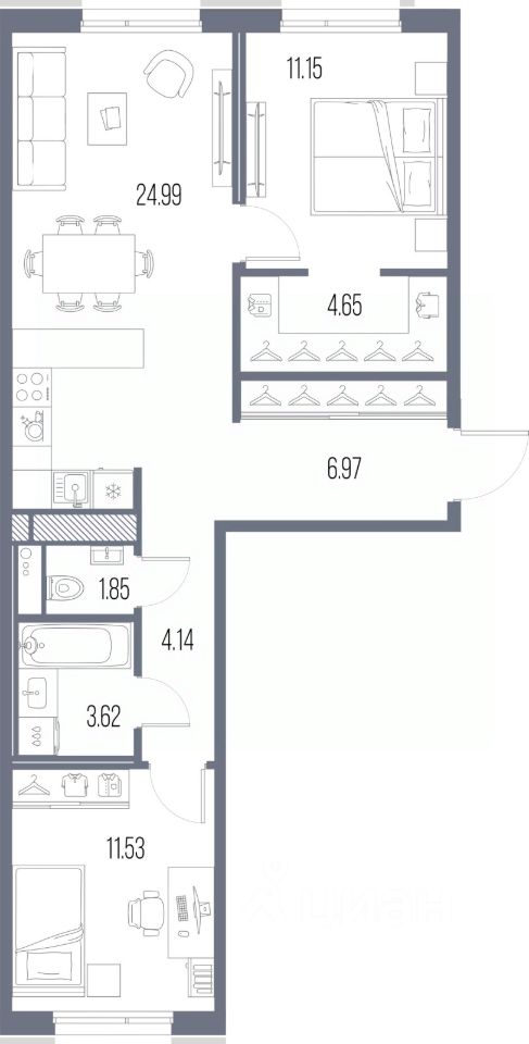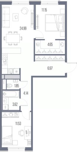 Двухкомнатная квартира от застройщика с предчистовой отделкой в ЖК "LEGENDA Васильевского" на 7 этаже. Общая площадь: 68.9 кв.м. Высота потолков 2.72 м.
