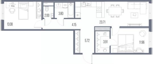 Просторная 2-комн. квартира с предчистовой отделкой в ЖК "LEGENDA Васильевского" на 7 этаже. Общая площадь: 68.33 кв.м. Высота потолков 2.72 м.
