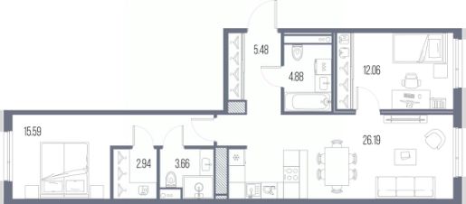 Продается 2-комн. квартира с предчистовой отделкой в ЖК "LEGENDA Васильевского" на 7 этаже. Общая площадь: 70.8 кв.м. Высота потолков 2.72 м.