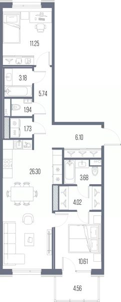 Просторная 2-комн. квартира с предчистовой отделкой в ЖК "LEGENDA Васильевского" на 7 этаже. Общая площадь: 74.55 кв.м. Высота потолков 2.72 м.