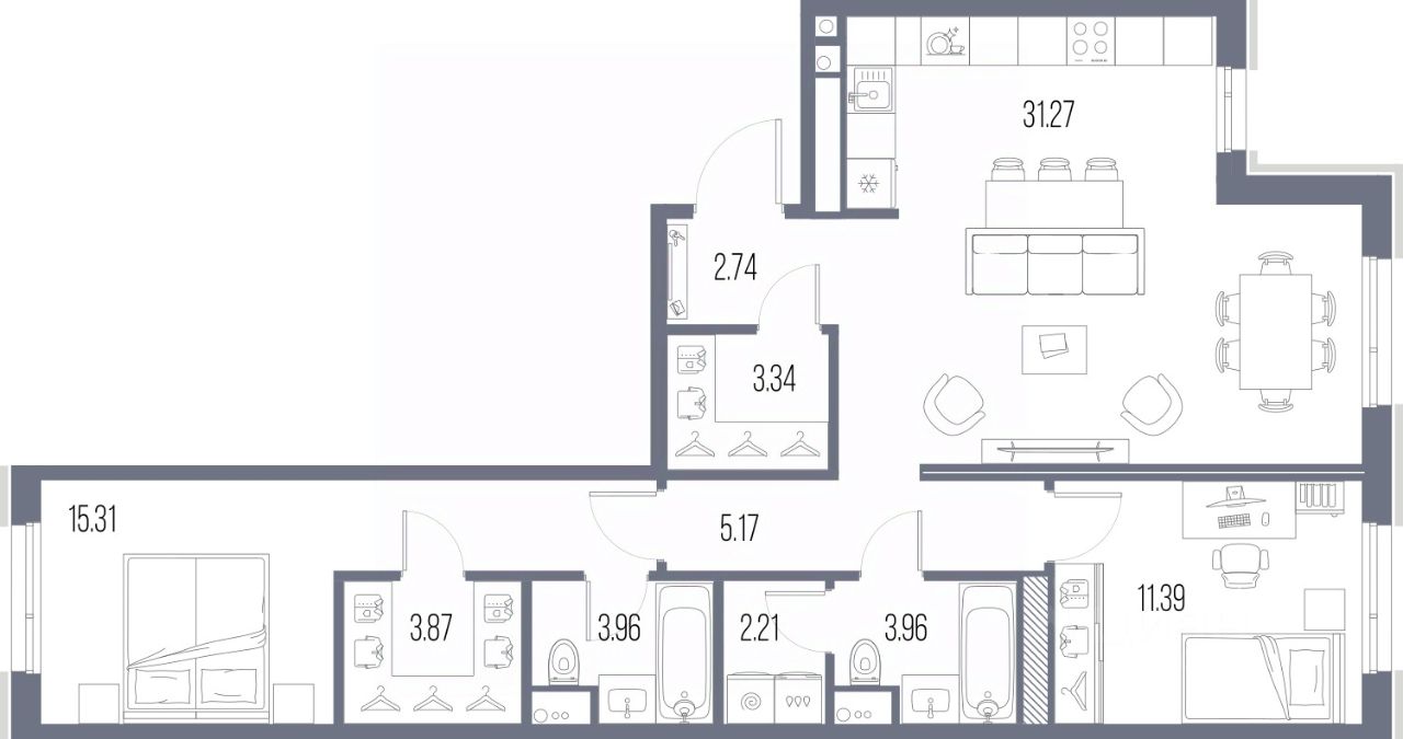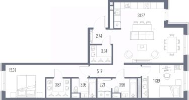 2-комн. квартира с предчистовой отделкой в ЖК "LEGENDA Васильевского" на 7 этаже. Общая площадь: 83.22 кв.м. Высота потолков 2.72 м.