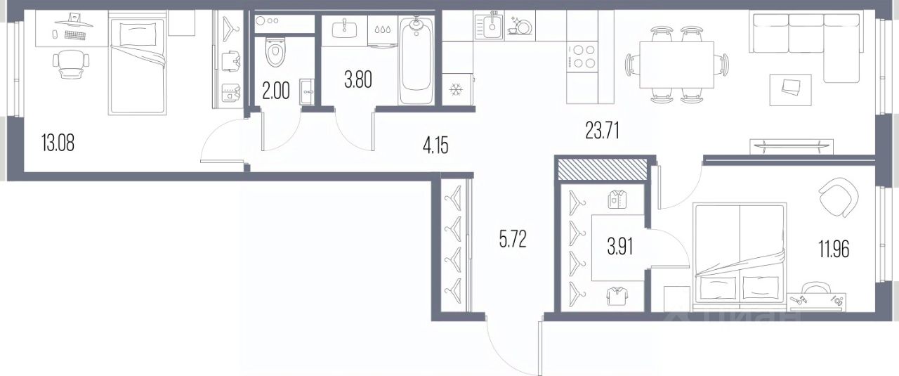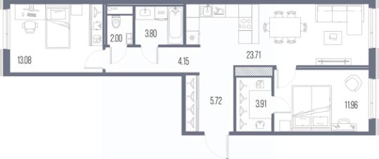 Продается 2-комн. квартира от застройщика с предчистовой отделкой в ЖК "LEGENDA Васильевского" на 8 этаже. Общая площадь: 68.33 кв.м. Высота потолков 2.72 м.