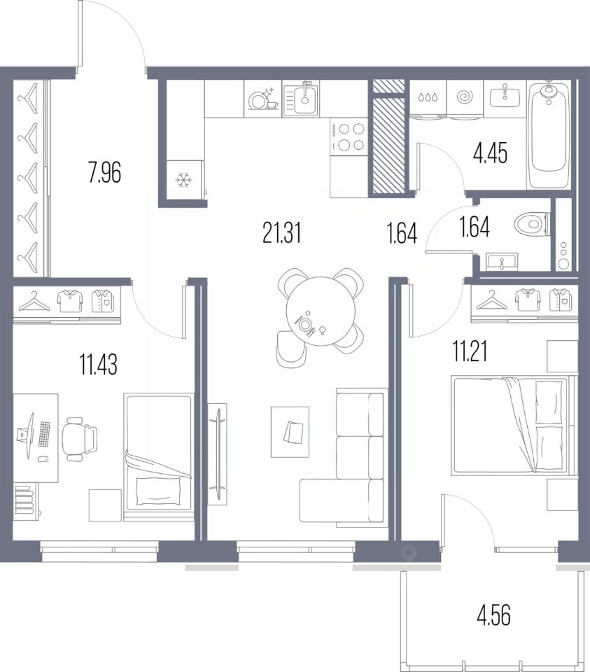 2-комн. квартира от застройщика с предчистовой отделкой в ЖК "LEGENDA Васильевского" на 8 этаже. Общая площадь: 59.64 кв.м. Высота потолков 2.72 м.