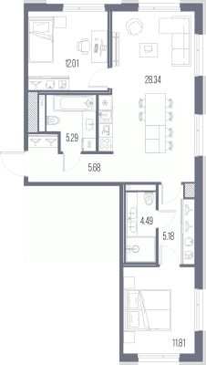 Двухкомнатная квартира от застройщика с предчистовой отделкой в ЖК "LEGENDA Васильевского" на 9 этаже. Общая площадь: 72.8 кв.м. Высота потолков 2.72 м.