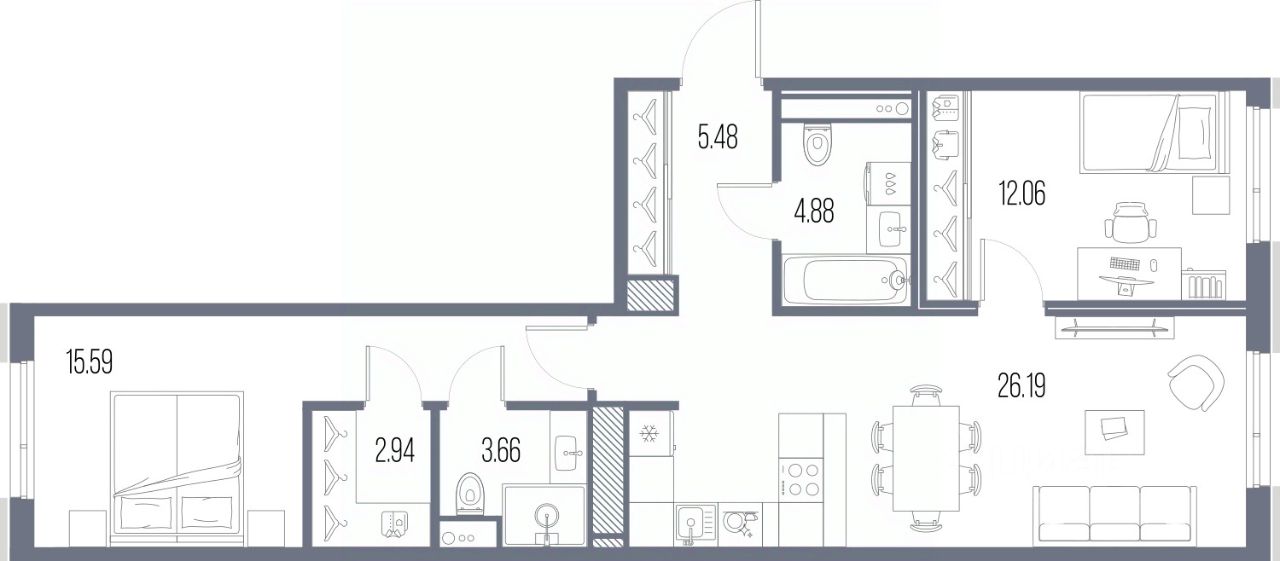 Просторная двухкомнатная квартира с предчистовой отделкой в ЖК "LEGENDA Васильевского" на 9 этаже. Общая площадь: 70.8 кв.м. Высота потолков 2.72 м.