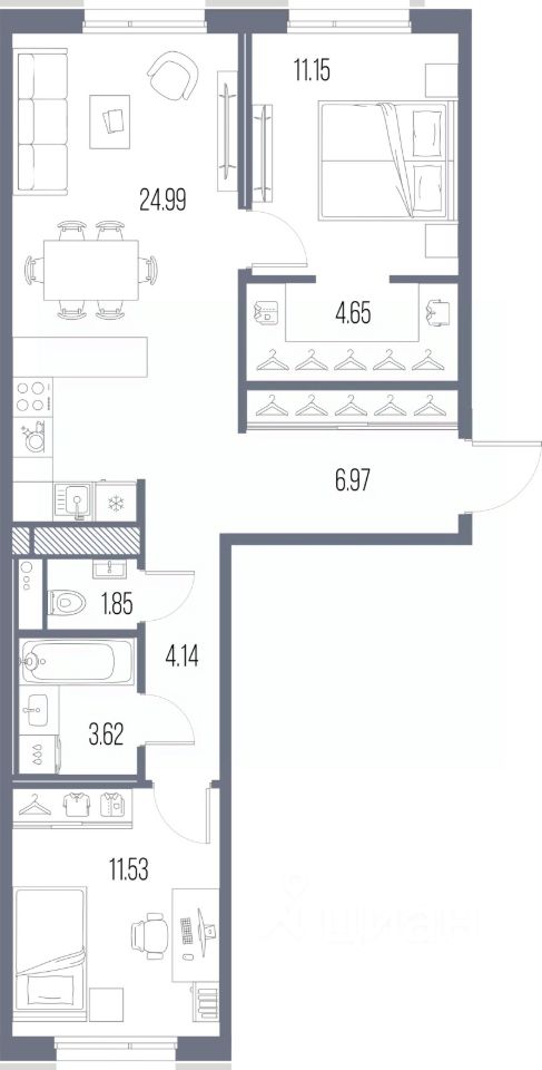 Двухкомнатная квартира с предчистовой отделкой в ЖК "LEGENDA Васильевского" на 10 этаже. Общая площадь: 68.9 кв.м. Высота потолков 2.72 м.