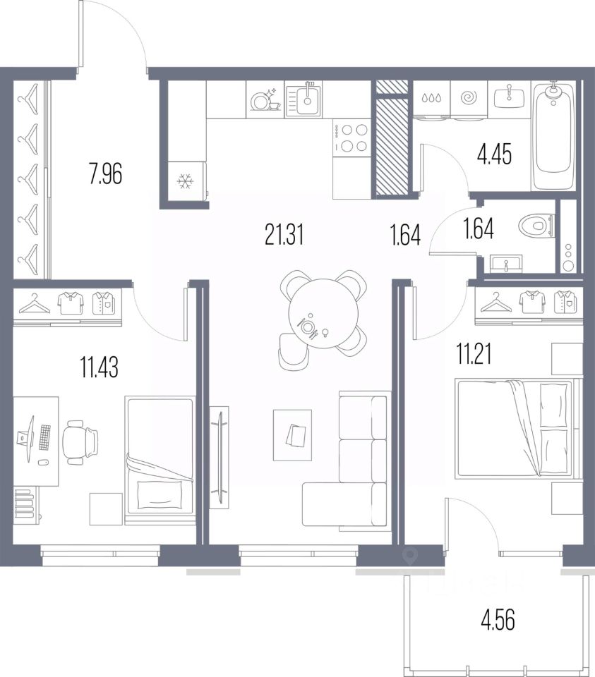 Продается 2-комн. квартира с предчистовой отделкой в ЖК "LEGENDA Васильевского" на 9 этаже. Общая площадь: 59.64 кв.м. Высота потолков 2.72 м.