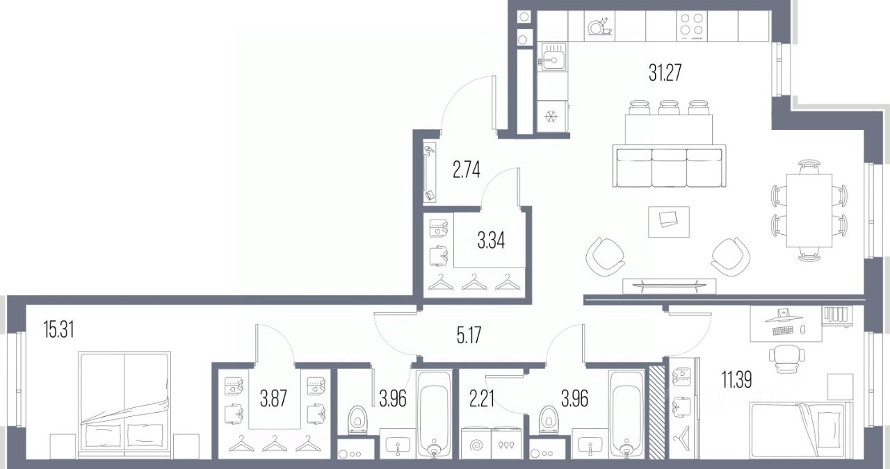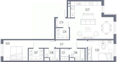 2-комн. квартира с предчистовой отделкой в ЖК "LEGENDA Васильевского" на 9 этаже. Общая площадь: 83.22 кв.м. Высота потолков 2.72 м.
