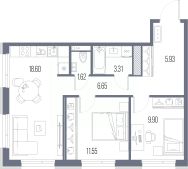 Двухкомнатная квартира от застройщика с предчистовой отделкой в ЖК "LEGENDA Васильевского" на 10 этаже. Общая площадь: 57.56 кв.м. Высота потолков 2.72 м.