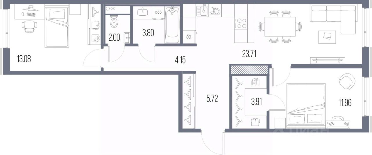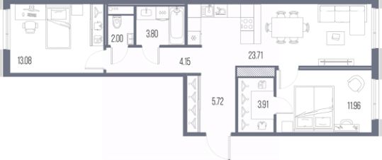Просторная 2-комн. квартира с предчистовой отделкой в ЖК "LEGENDA Васильевского" на 10 этаже. Общая площадь: 68.33 кв.м. Высота потолков 2.72 м.
