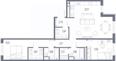 Просторная двухкомнатная квартира с предчистовой отделкой в ЖК "LEGENDA Васильевского" на 10 этаже. Общая площадь: 83.22 кв.м. Высота потолков 2.72 м.