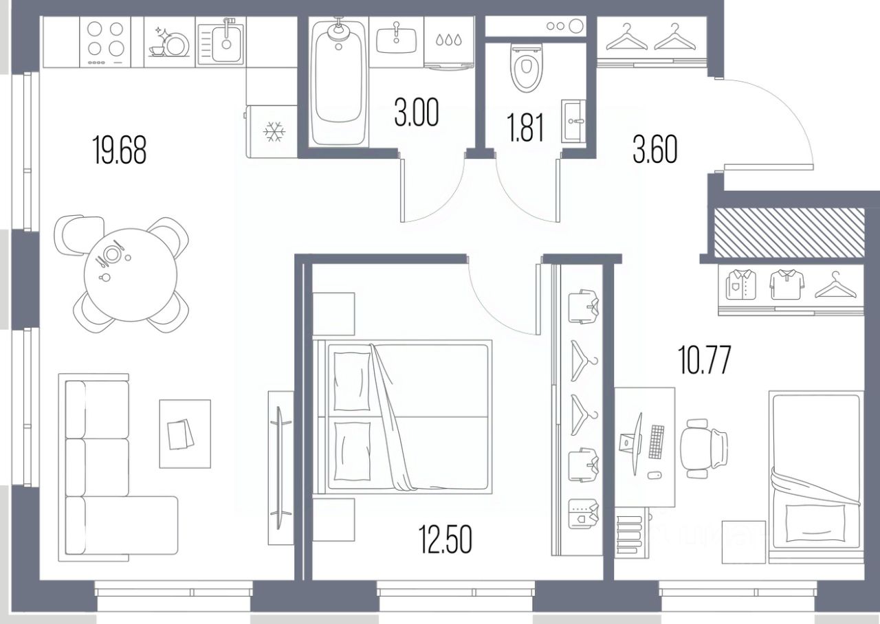 Двухкомнатная квартира с предчистовой отделкой в ЖК "LEGENDA Васильевского" на 4 этаже. Общая площадь: 55.23 кв.м. Высота потолков 2.72 м.