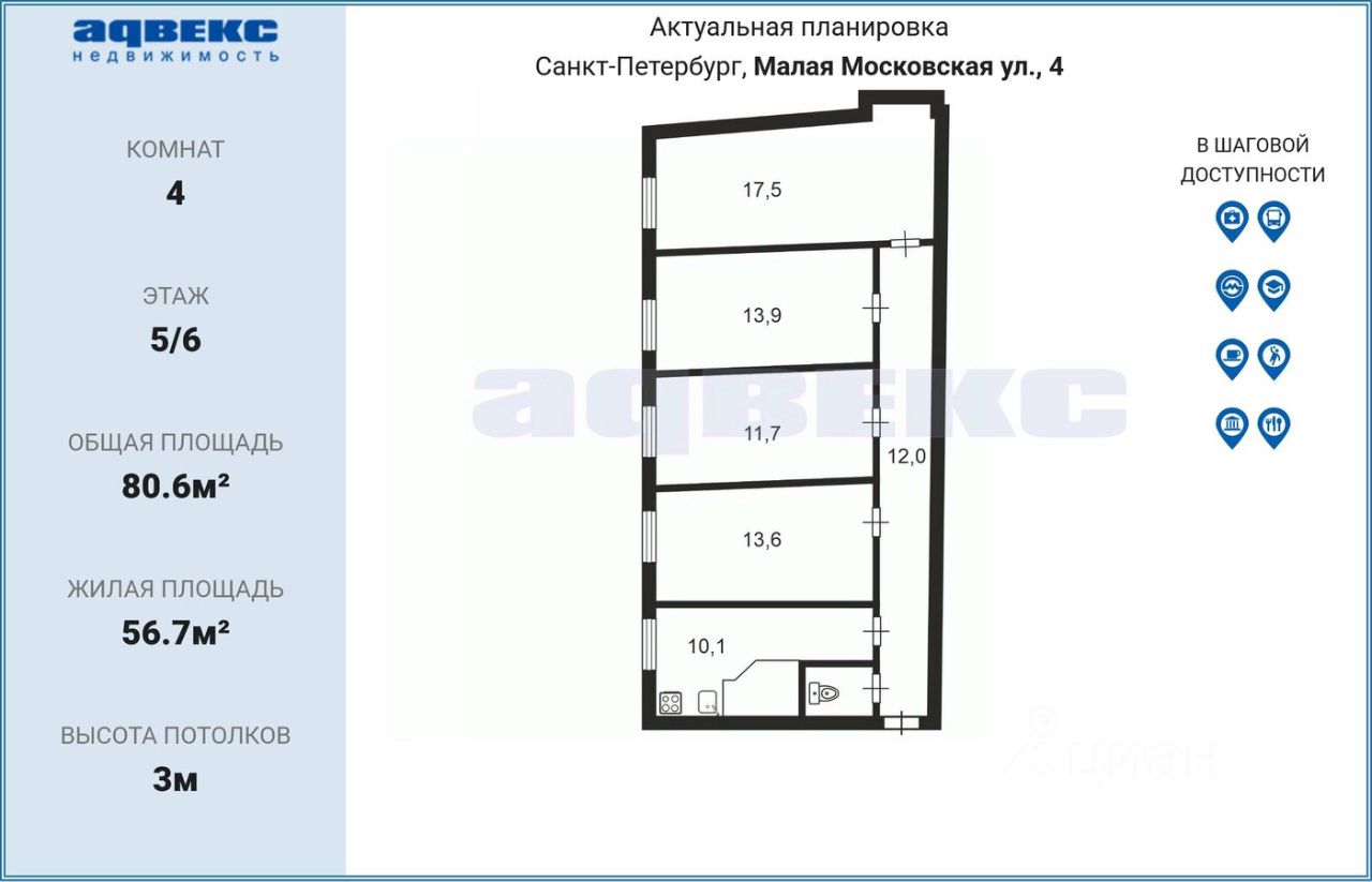 Общая площадь квартиры 80.6 кв. метров, из которых жилая площадь 56.7 кв. метров (комнаты: 13.6 + 11.7 + 13.9 + 17.5).