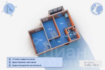 Квартира общей площадью 53 м² расположена на 10-м этаже нового дома. Пространство спланировано продуманно: две изолированные комнаты площадью 14,5 м² и 12,3 м² создают условия для отдыха и личного пространства.