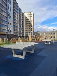 Территория комплекса закрыта от машин, благоустроена и озеленена. Здесь оборудованы детские и спортивные площадки, пешеходные дорожки, зоны отдыха и площадка для выгула собак.