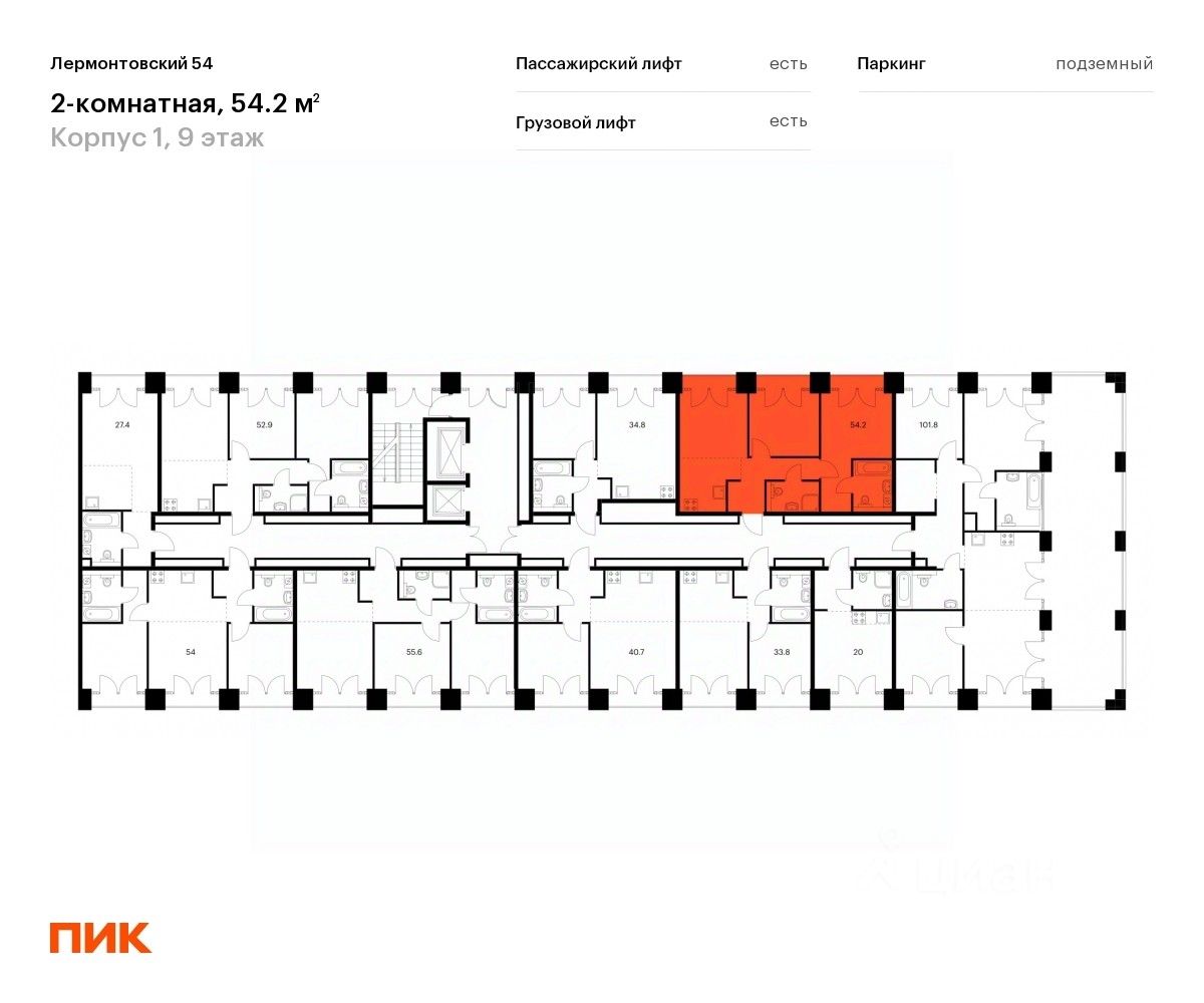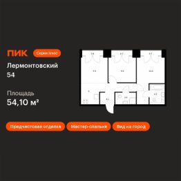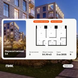 Продаётся 2-комн. квартира площадью 54,1 кв.м на 9 этаже 9 этажного дома (Корпус 1, Секция 2) проекта ПИК Лермонтовский 54. Светлый просторный подъезд на уровне земли, функциональная планировка, большие окна, предчистовая отделка.