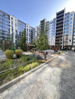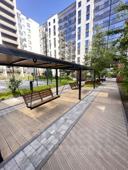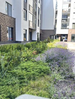 - Во дворе разбит полноценный дендропарк с геопластикой, разнообразными видами цветов, растений и кустарников. Растения специально подобраны таким образом, чтобы каждый сезон радовать жителей яркими красками;