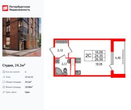 Удобная, классическая, функциональная европланировка, вместительная прихожая 3.1 м². Общая площадь студии - 24.2 м², жилая 18.08 м², высота потолка 3 м.