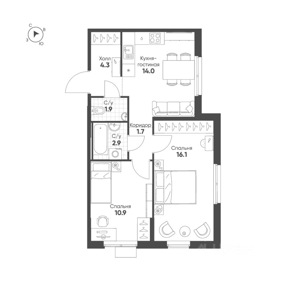 Продается квартира 50, по адресу Ленинградская область, Всеволожский муниципальный район, Муринское городское поселение,город Мурино, корпус Ягодное Река Парк, 1 очередь, участок 1.10, корпус 1 в Ягодное Река Парк на 10 этаже, с площадью 51.8 м2.