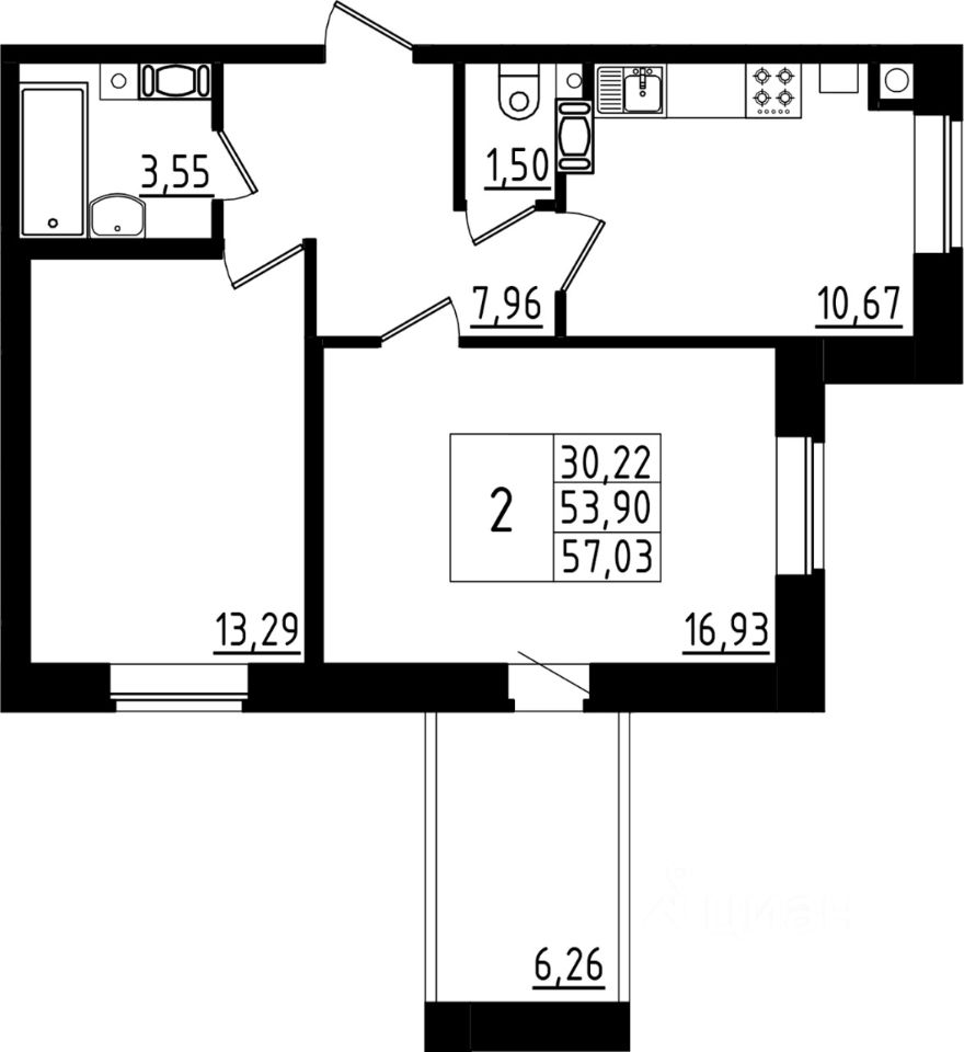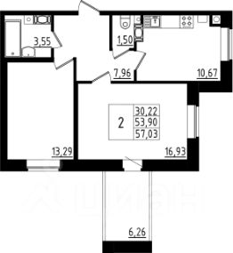 Продаётся двухкомнатная квартира площадью 57,03 м² в современном жилом комплексе Высоцкий (Русско-Высоцкое, Ломоносовский район).