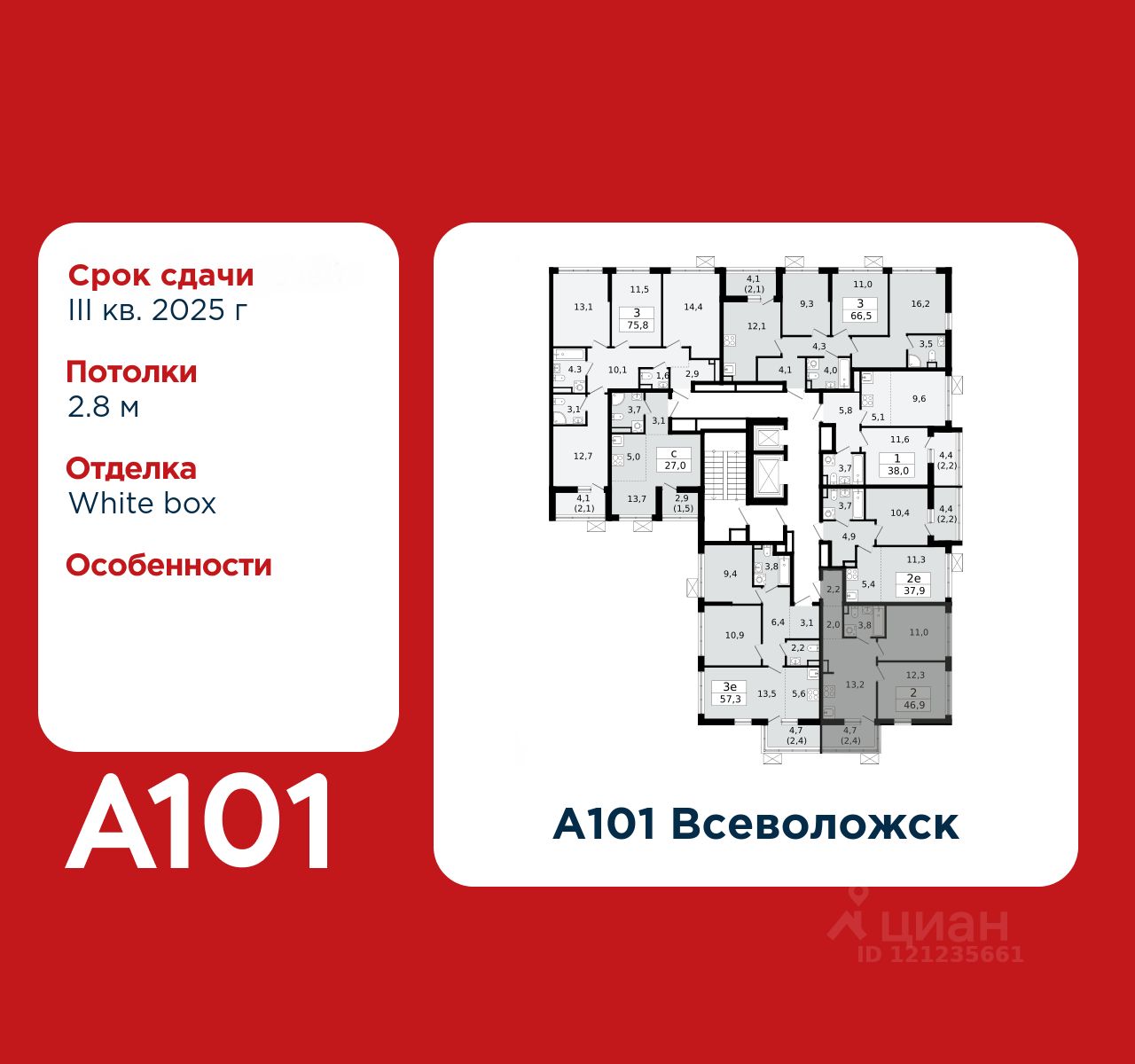 2-комнатная квартира площадью 45.90 в ЖК "А101 Всеволожск" c лоджией на 7 этаже. Квартира white box. Вид из окна во двор. В квартире 1 санузел. Высота потолков 2.8 м.