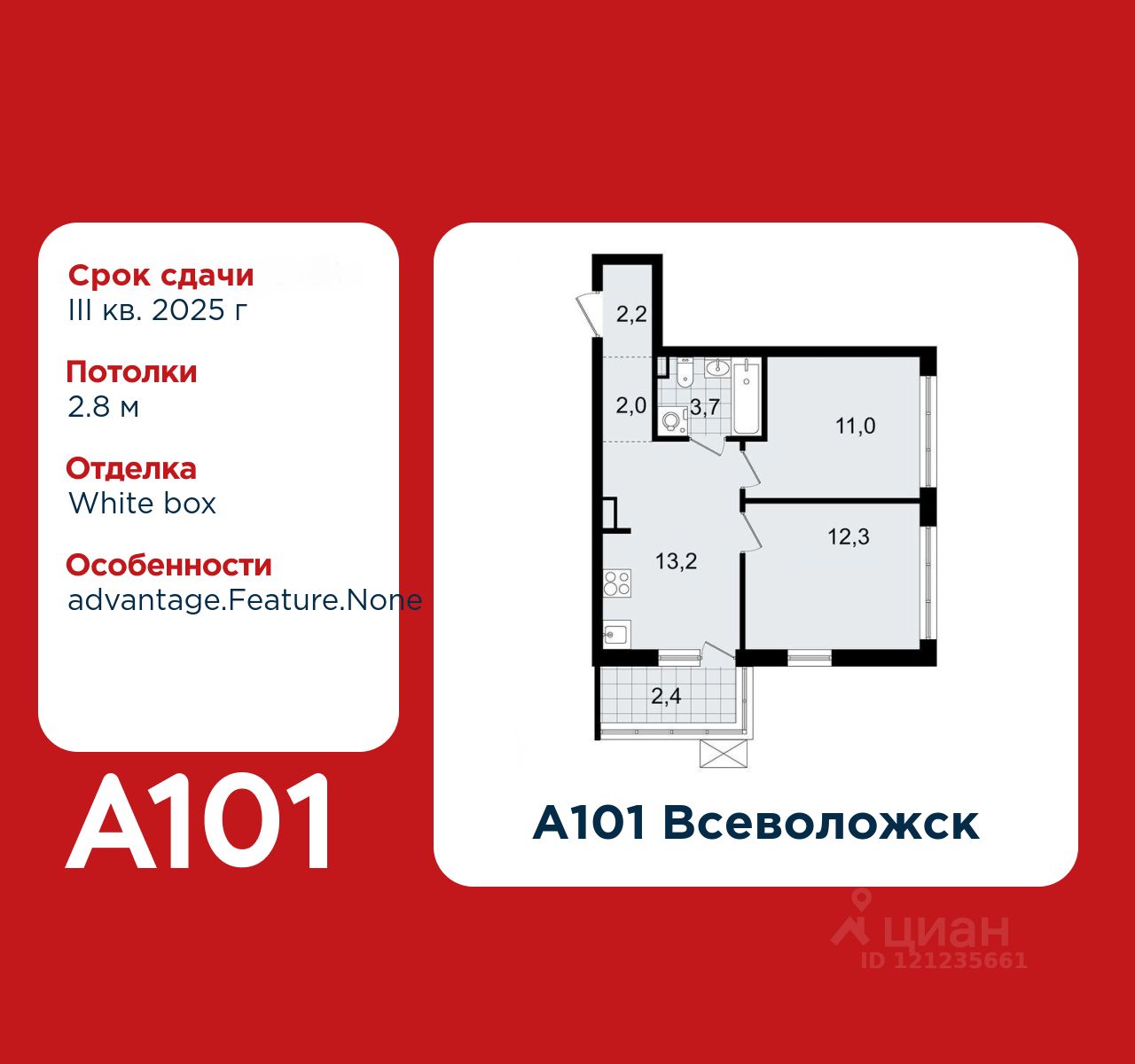 2-комнатная квартира площадью 45.90 в ЖК "А101 Всеволожск" c лоджией на 9 этаже. Квартира white box. Вид из окна во двор. В квартире 1 санузел. Высота потолков 2.8 м. Ключи в 2025 году.