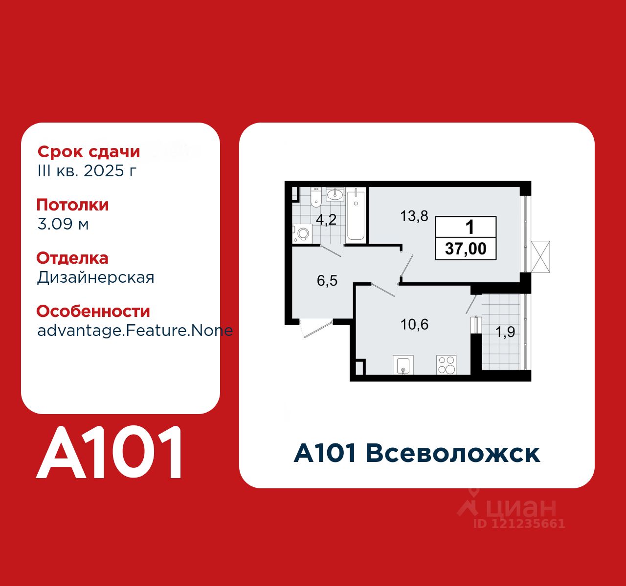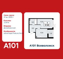 1-комнатная квартира площадью 37.00 в ЖК "А101 Всеволожск" c лоджией на 12 этаже. Квартира с отделкой. Вид из окна во двор. В квартире 1 санузел. Высота потолков 3.09 м. Ключи в 2025 году.