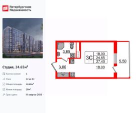 Удобная, классическая, функциональная европланировка, вместительная прихожая 3 м². Общая площадь студии - 24.65 м², жилая 18 м², высота потолка 3 м.