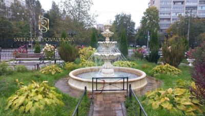Прямо от дома начинается живописный сквер с пешеходными дорожками, заканчивающийся ухоженным садом с фонтаном при местном храме.