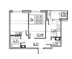 Общая площадь квартиры составляет 47 кв. м, из которых 24,38 кв. м приходится на жилую площадь. Высота потолков в 3 метра создаёт ощущение простора и свободы. Две изолированные комнаты идеально подойдут как для молодой семьи, так и для пары без детей или студентов, которые ценят личное пространство.