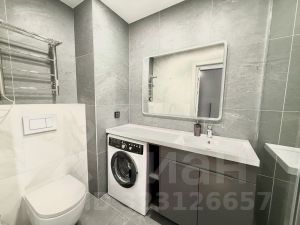 Современная ванная: душевая кабина, стиральная машина, полотенцесушитель, зеркало с подсветкой.
