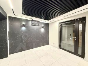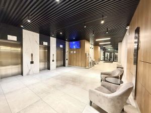 Современный холл с лаунж-зоной для гостей и жильцов.