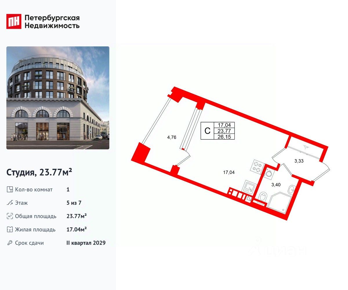 Удобная, классическая, функциональная европланировка, просторная прихожая 3.33 м². Общая площадь студии - 23.77 м², жилая 17.04 м², высота потолка 3 м.